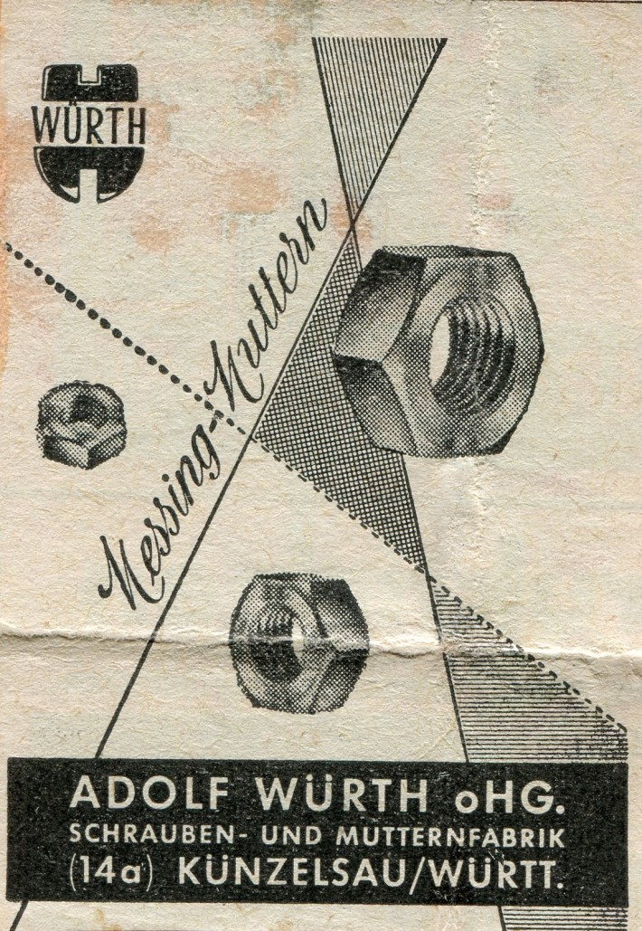 Adolf Würth, der Vater von Reinhold Würth, gründet in Künzelsau, Deutschland, eine Grosshandelsfirma für Schrauben und Muttern. Im Gebäudekomplex der Schlossmühle in Künzelsau hatte die Firma Würth ihren ersten Firmensitz.